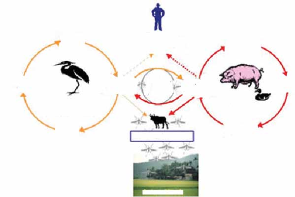 Trong tự nhiên, vi-rút được duy trì và lây truyền qua chu trình bao gồm: nhân tố trung gian muỗi (chủ yếu là giống Culex), chim và động vật hữu nhũ. Sự tồn tại của vi-rút chủ yếu nhờ vào những động vật mà sự nhiễm trùng không có biểu hiện triệu chứng lâm sàng.
